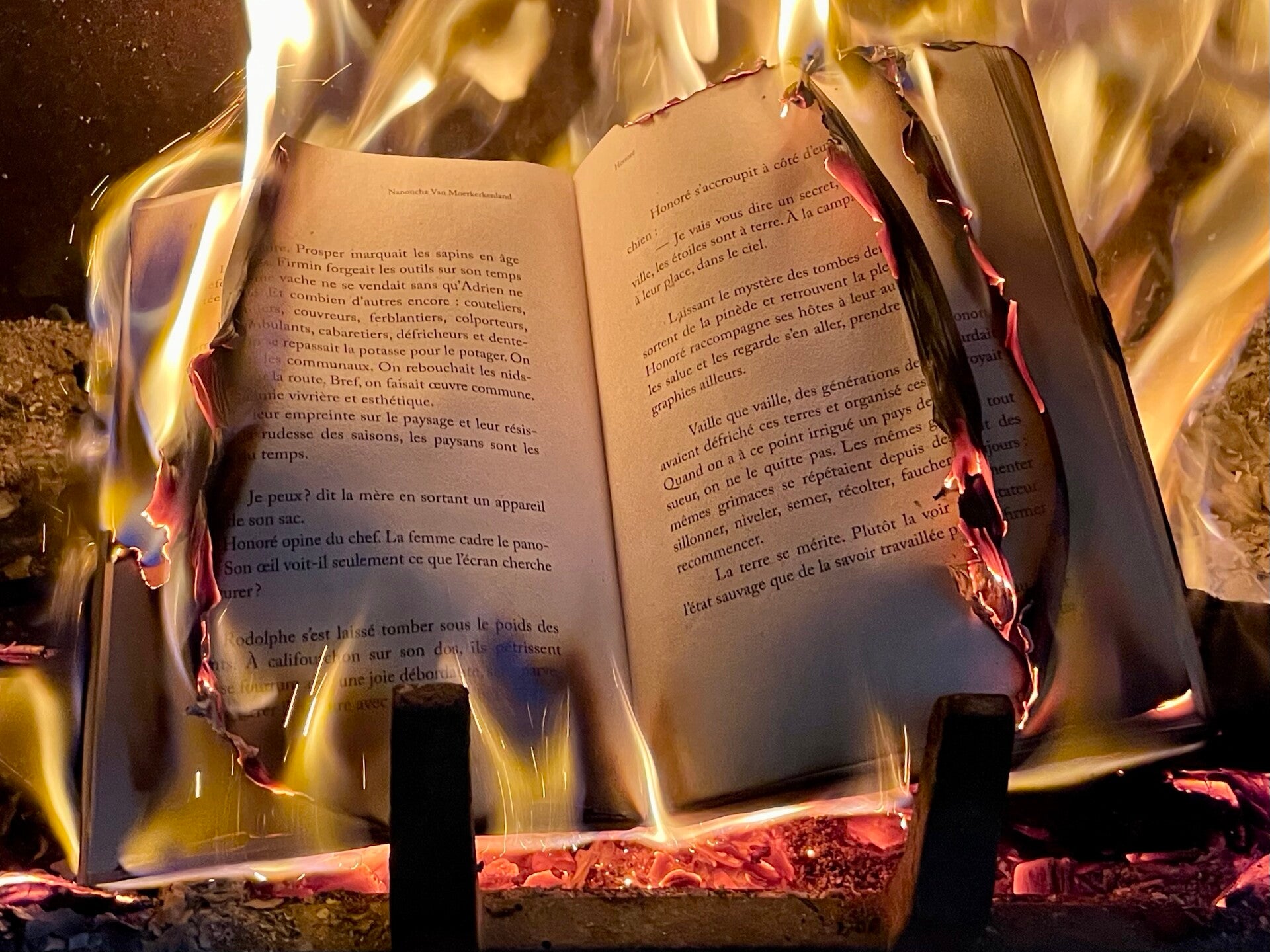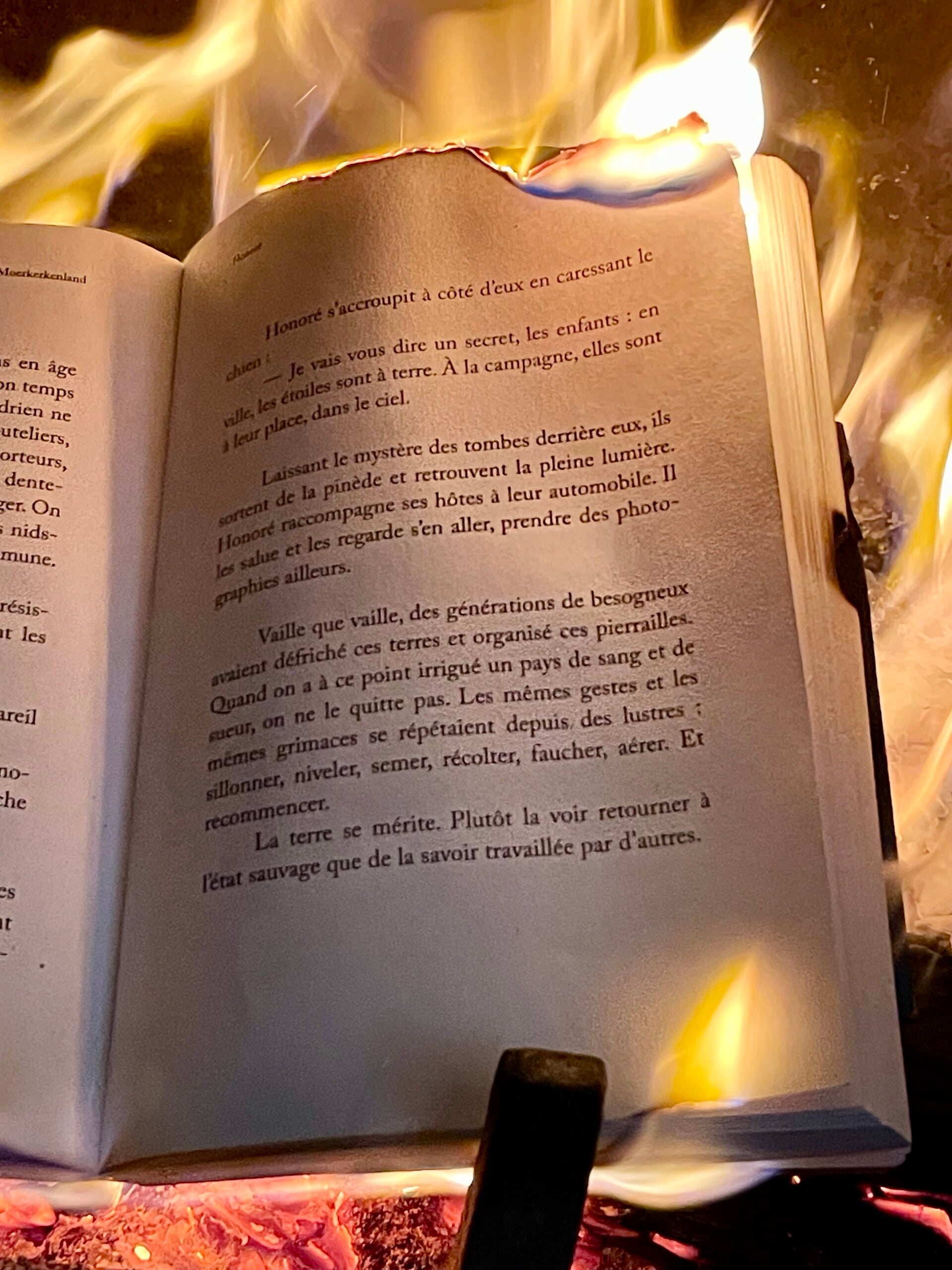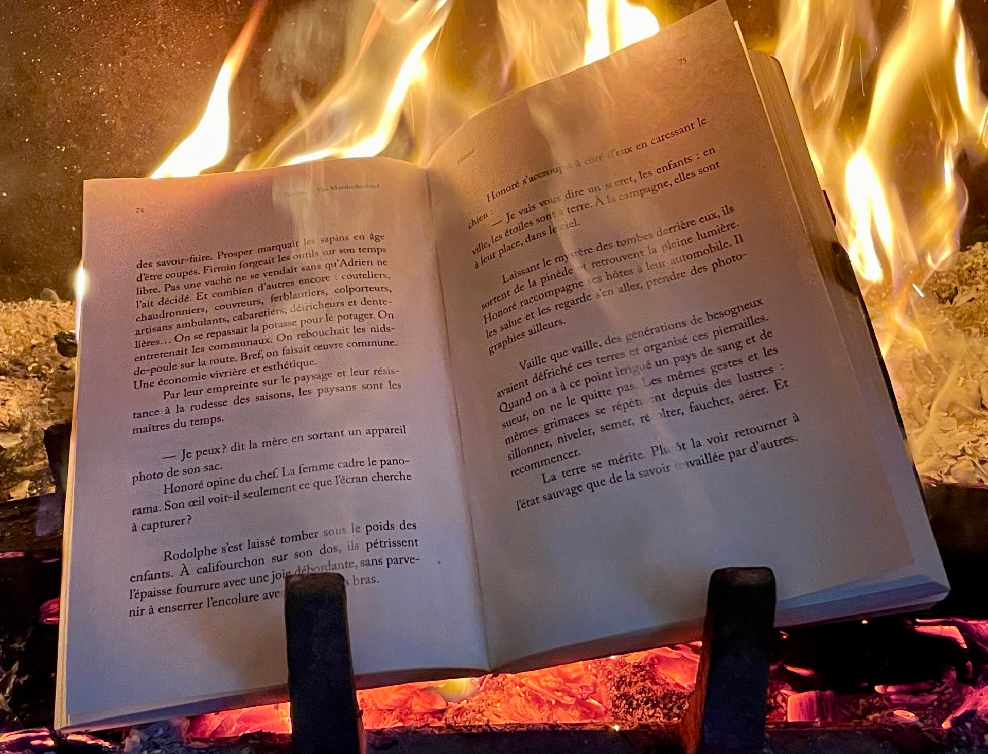« Honoré ravive le feu avec un morceau d’amadou et regarde les flocons de lumière monter dans la cheminée »